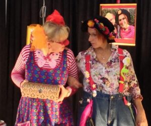Ulrike Sonderhüsken und Sylvie Blätgen erzählen als Clowninnen mit Hospizhund Motte eine Geschichte von Abschied und Traurigsein, die auch zum Lachen ist.